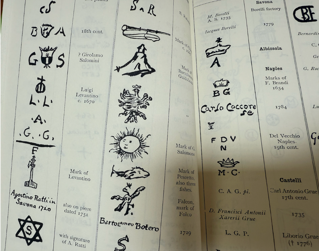 The inside of the book is like the back of the notepad of a middle schooler – one either practicing a signature or dreaming out the window, drawing while not looking. Small irregular shapes… Like the Monograms of Nicola Pellipario who came to Urbino in 1519 and worked in the bottega of his son Guido Fontana. Or the marks of Gubbio and Giorgio Andreoli known for their gold and carmine colors. (The secret of the chemical process which made the potter so famous, lost now partially rediscovered).