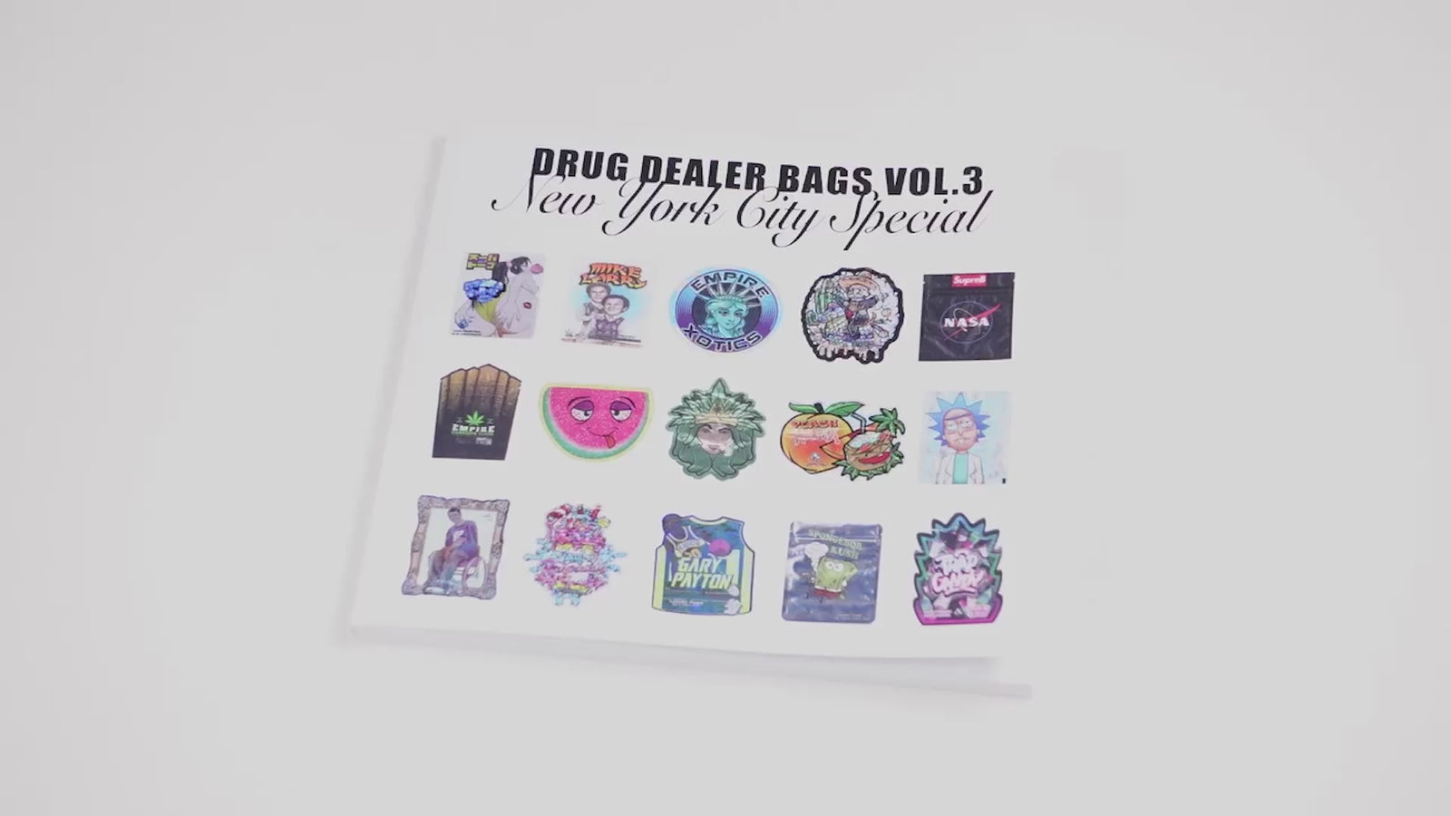 This book is the third volume in the Drug Dealer Bags series, collected and classified by Hector Mosko. Like the previous editions, it features over 100 baggies, but this time, all sourced exclusively in New York City. Used to transport drugs (primarily weed or hash) from seller to client, these small plastic zip bags began incorporating high-definition, pop-culture inspired designs and prints around 2018. These visual elements quickly became a marketing tool, boosting both appeal and sales. With the legalization of cannabis in several American states, some of these bags have even become branded, blurring the lines between underground culture and commercial enterprise. Within a remarkably short time, these designs transformed the market, becoming a widespread phenomenon. All items featured in this volume were collected in 2024 by Hector Mosko.