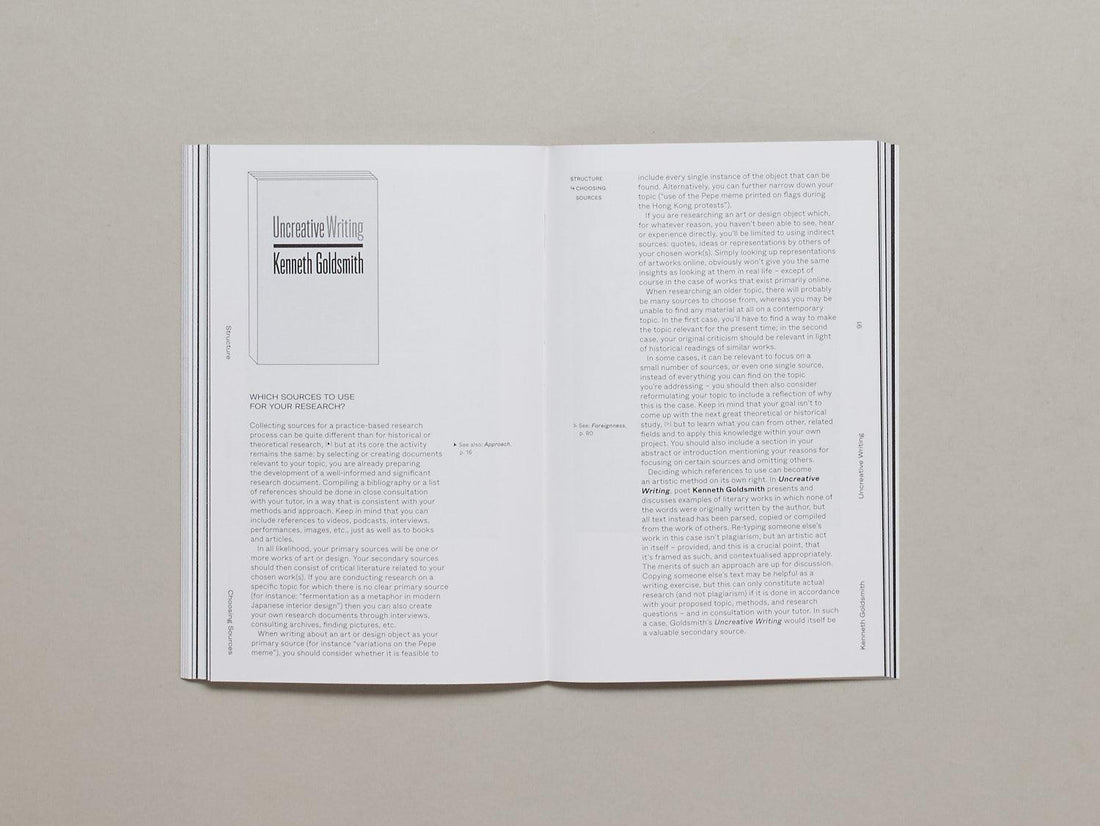 What is artistic research? What is a research document? How do these relate to the making process, invention, and creativity? What exactly is expected of me? If you have ever asked yourself any of these questions, then this book is for you. Research For People Who (Think They) Would Rather Create addresses all relevant aspects that need to be considered during a research and documentation process, such as: finding the right topic and approach; formulating your research question; working out your methods; choosing one or more suitable writing styles; and considering the possible roles of visual, virtual, auditory, embodied, and spatial materials. Research For People Who (Think They) Would Rather Create shows a multitude of examples from the field of art and design – each of which illustrates one specific aspect of developing a thesis, essay, paper, research document, or however else it may be referred to in your own setting. You can read this book from cover to cover, or you can immediately flip to those subjects which you find most relevant at any given moment. Ultimately, Research For People Who (Think They) Would Rather Create is an invitation to contribute – quite literally, with your own projects, examples, and questions – since the ultimate goal is to help you develop your own research. Bio Dirk Vis (1981) writes fiction, columns, scripts and essays on art and technology, mostly in Dutch. Vis lives and works in Amsterdam. He studied Image & Language at the Rietveld Academy, Amsterdam and Graphic Design at the Sandberg Institute, Amsterdam. His works of non-fiction and fiction have been published in Dutch: a limited edition of Bestseller (2009), the ebook The reality-essay (2017) and a series of texts in different forms and media e.g. chapbooks, performances, websites, etcetera. He's directed several video works based on his texts. Vis is contributing editor of Dutch literary magazine De Gids (The Guide) and founder of De Internet Gids. He is lecturer-researcher at the Willem de Kooning Academy in Rotterdam and theory lecturer at the Royal Academy of Art in The Hague, besides having guest lectured at several other European art universities. Vis is currently compiling the Indexicalist Manifesto.
