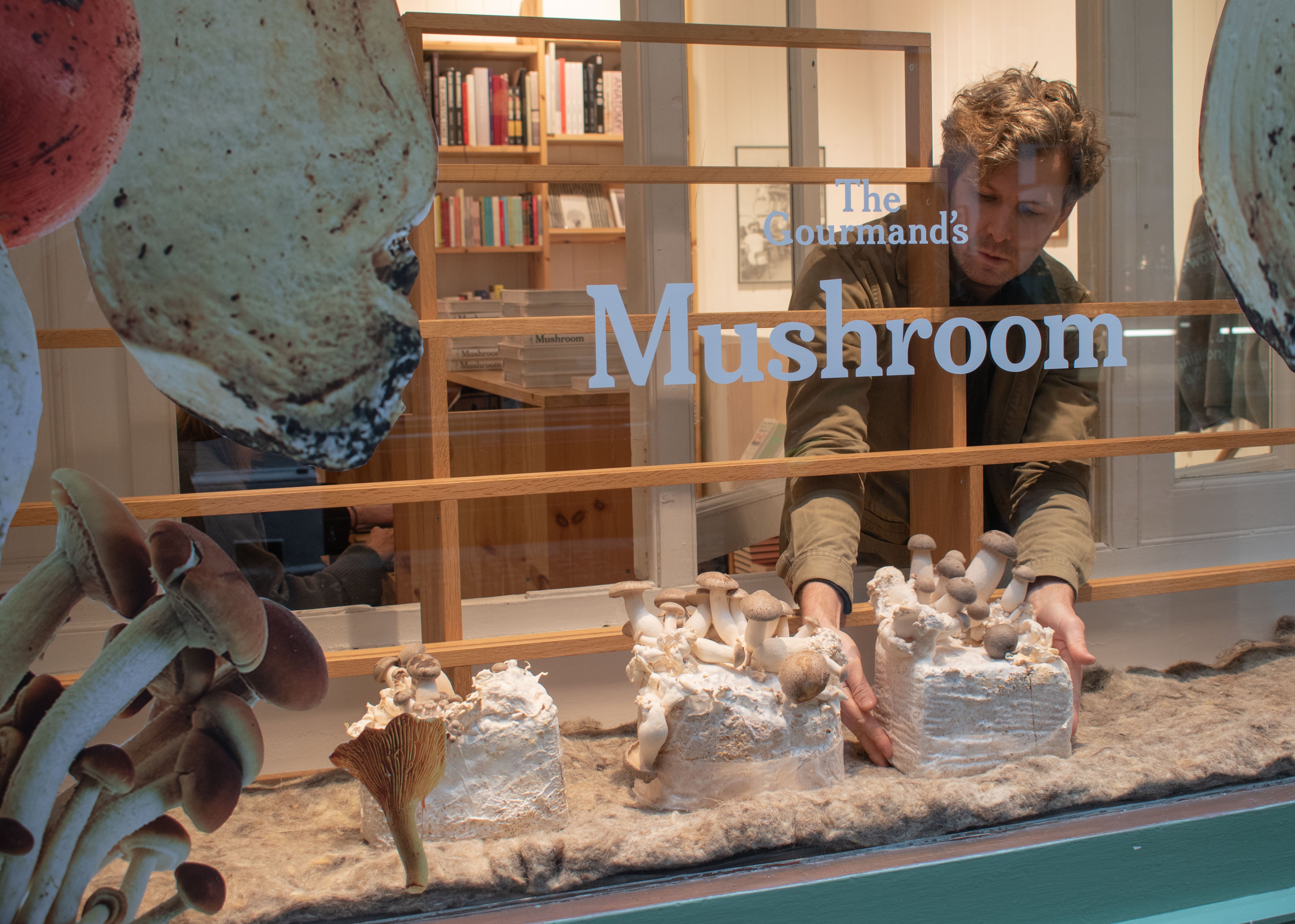 11.00am - The Tenderbooks window display changes every week and today was a very fun installation to celebrate The Gourmand’s Mushroom, a collection of stories and recipes published by The Gourmand and Taschen. Here the window was transformed into a little forest complete with a bed of growing oyster mushrooms supplied by the sustainable fruit and veggie specialists Natoora.