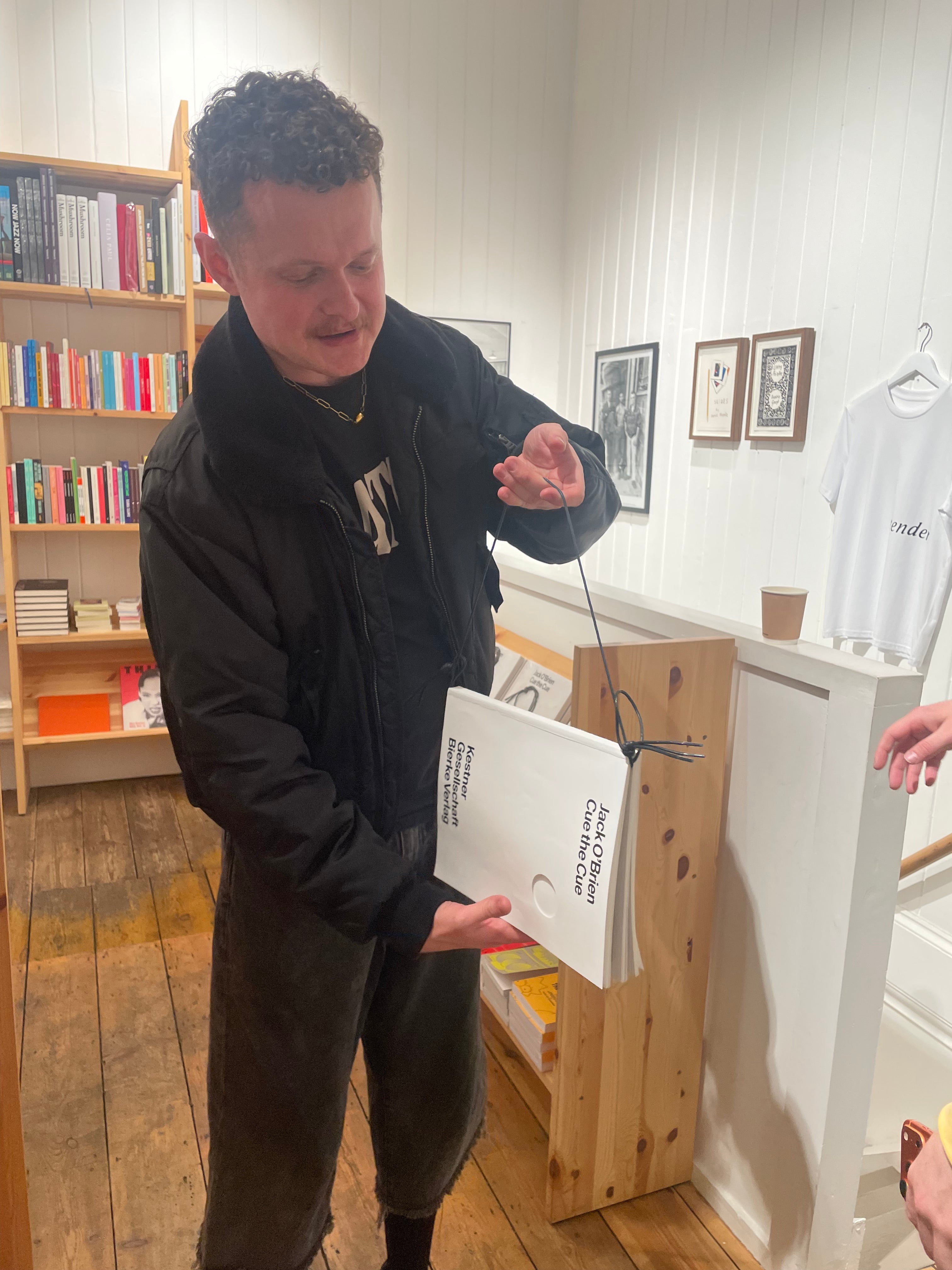 6.00pm - We host one or two events at the shop every week for independent publishers. This evening it’s the launch of a gorgeous artist book Cue the Cue by Jack O’Brien published by one of our favourite imprints Bierke. Jack describes the book as a ‘ghost of a fashion magazine’ and it’s been so cleverly designed to mimic the look of a magazine in the return pile with its covers ripped off. There’s also a loose leather bootlace that looks slinky under the shrink wrap and acts as a curious bookmark. Here’s Jack demonstrating a nifty manoeuvre for turning the bookmark into a portable handbag strap :)