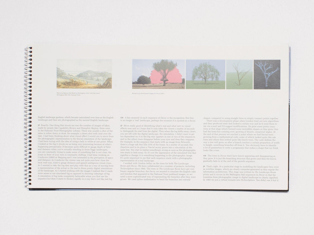 Jane Prophet’s ‘Decoy’ was a groundbreaking digital art work in which images of the grounds of iconic British country houses were overlaid with subtly evolving computer-generated landscapes, highlighting both the artificiality of these apparently natural vistas, and the alternative ways in which nature might have transformed the scene over time. Reflecting on the history and politics of landscape design, and the extent to which it was informed by the conventions of classical painting, the book features essays by Sophie Howarth and Steven Bode, and an interview with the artist by Simon Willmoth.